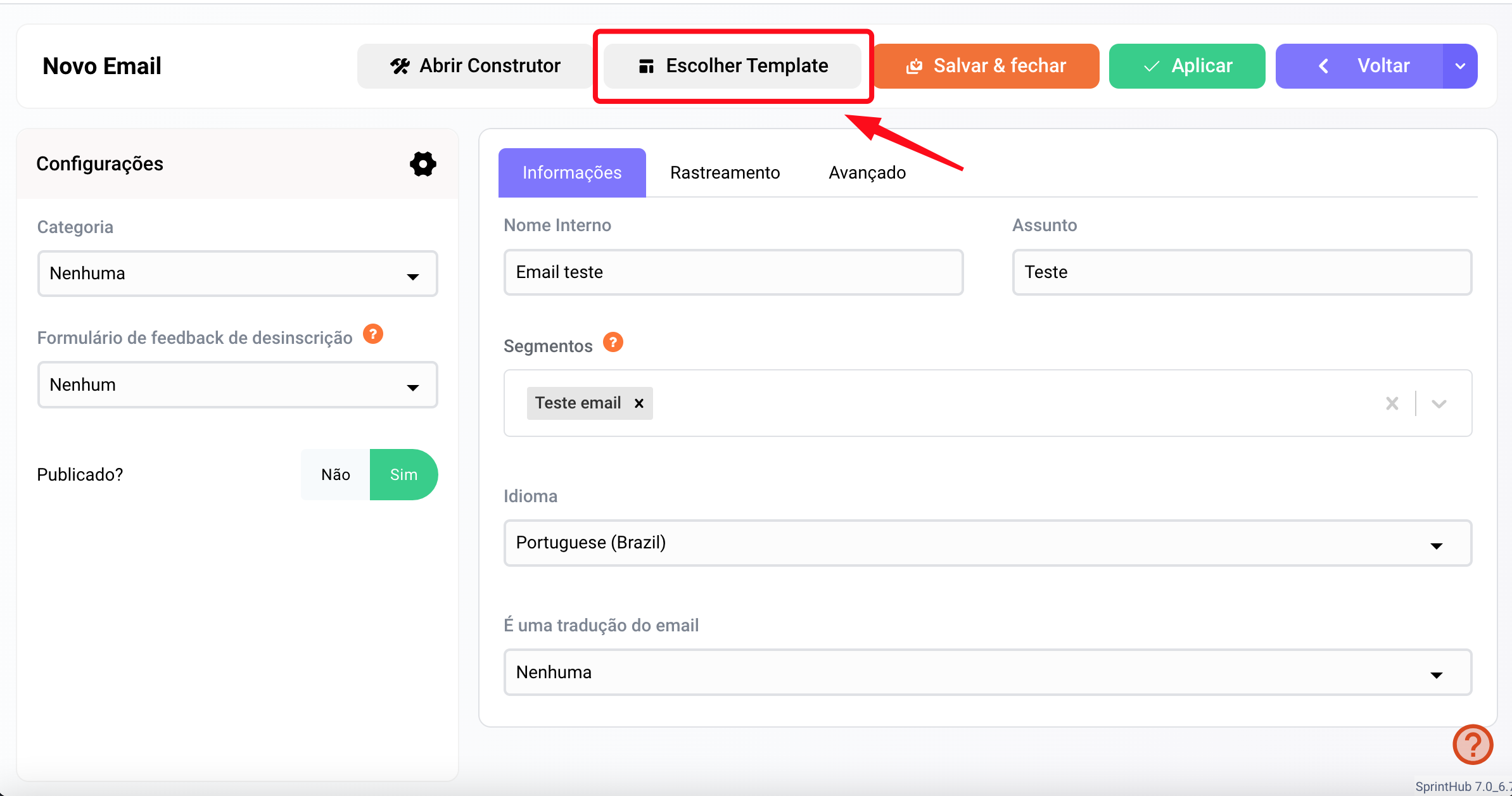 Após preencher as informações do seu e-mail clique em '**Escolher Template**';