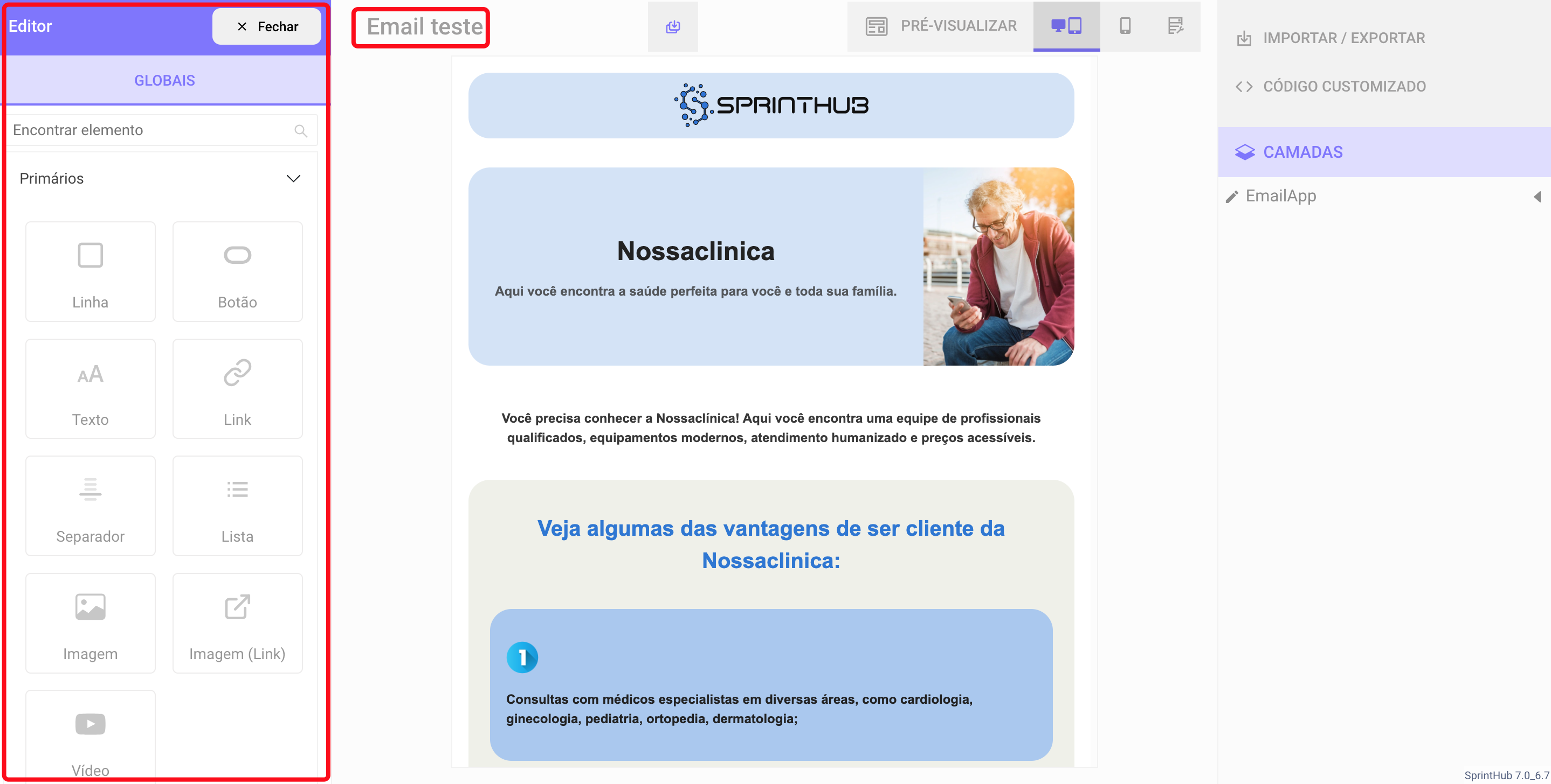 Ao selecionar seu modelo de Template, voce poderá **editá-lo** da forma que preferir, podendo alterar **Nome do e-mail**, **imagens**, **textos**, adicionar  **Links de suas redes sociais** entre outros.