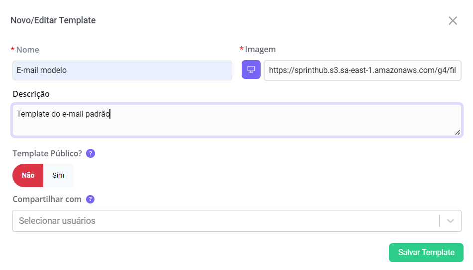**Template Público:** Se habilitado, todos os usuários do sistema poderão visualizar e editar o template;