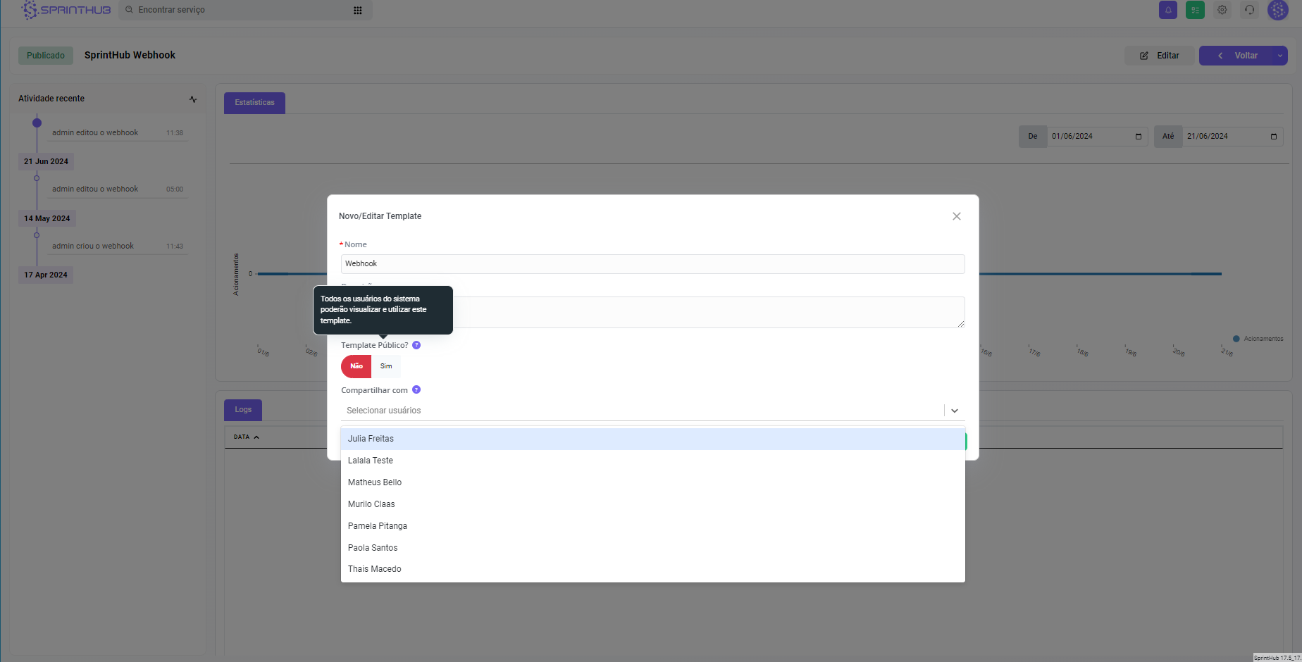 Se sim, todo e qualquer usuário do seu ambiente Sprinthub pode acessar, com o não você precisar selecionar quem pode ver o template.