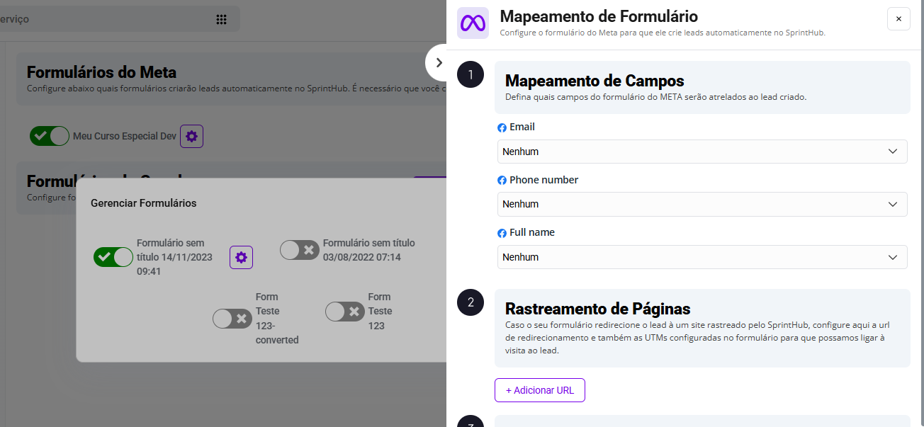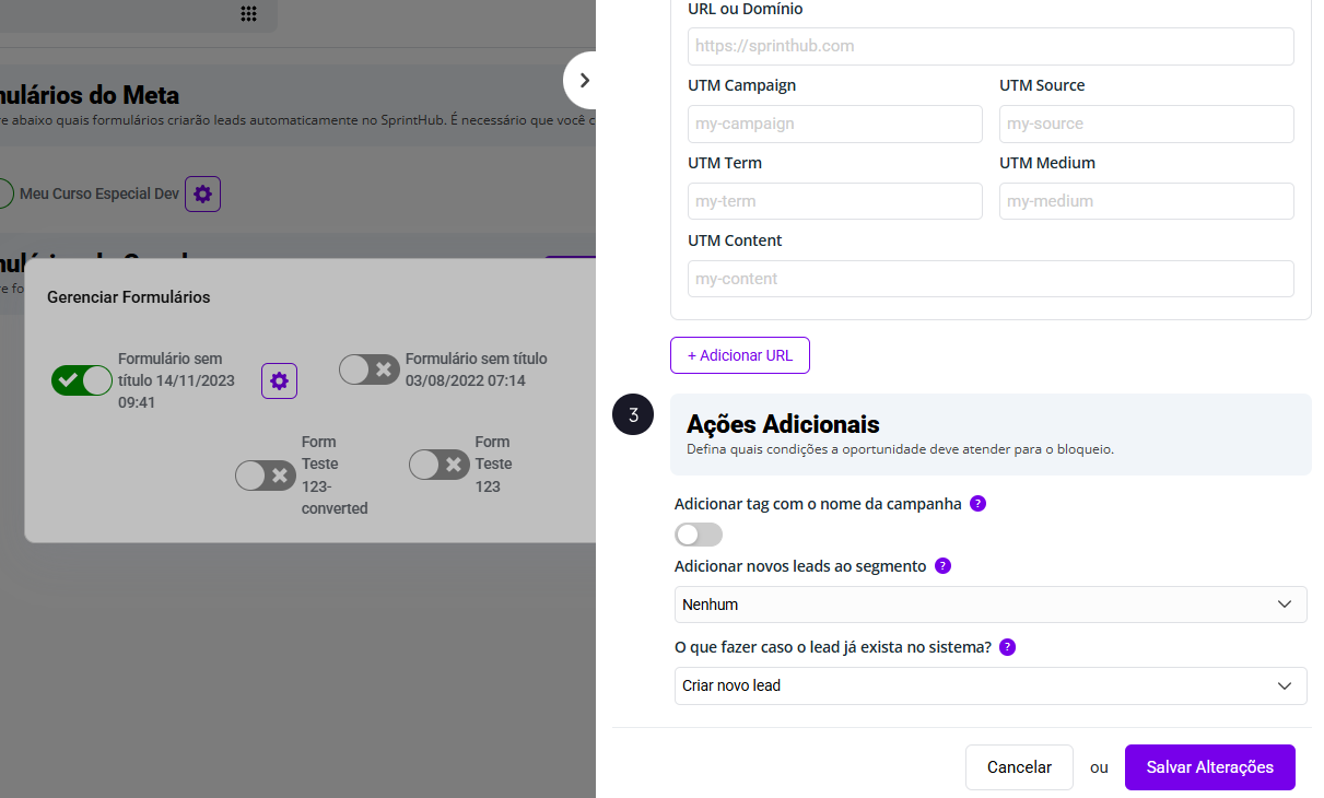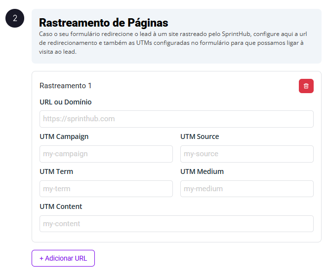 Caso o seu formulário redirecione o lead à um site rastreado pelo SprintHub, configure aqui a url de redirecionamento e também as UTMs configuradas no formulário para que possamos ligar à visita ao lead.