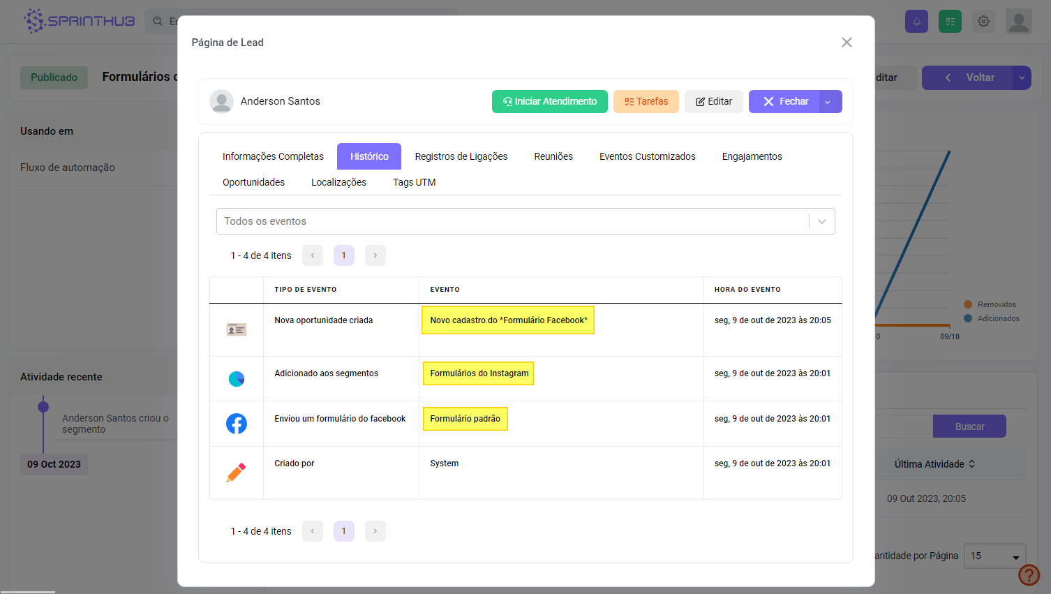 E ao clicar no lead conseguimos ver no histórico do lead que ele de fato veio do preenchimento do **"Formulário do Instagram"**, foi adicionado ao respectivo segmento e também foi criado no CRM automaticamente: