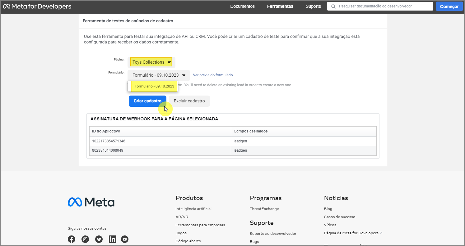 Agora para testar o envio pelo formulário do **Facebook**, clique neste link: <https://developers.facebook.com/tools/lead-ads-testing>