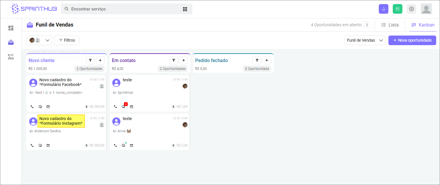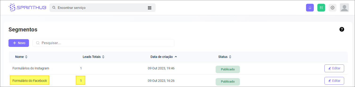 Após o envio vamos validar se o cadastro caiu na SprintHub, para isso vamos analisar primeiro o segmento **"Formulário Instagram";**