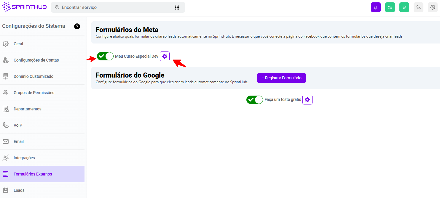 Depois selecione o formulário que deseja integrar e clica na engrenagem: