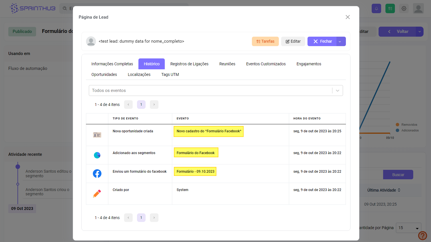 E ao clicar no lead conseguimos ver no histórico do lead que ele de fato veio do preenchimento do **"Formulário do Facebook"**, foi adicionado ao respectivo segmento e também foi criado no CRM automaticamente:&#x20;