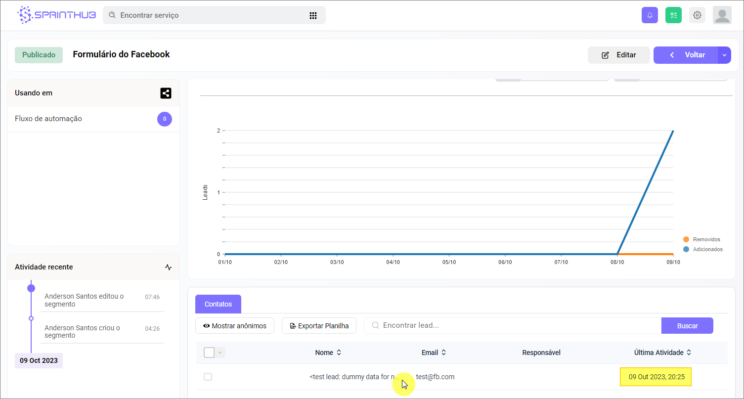 Podemos ver que no segmento **"Formulário Facebook"** já temos um lead cadastrado;