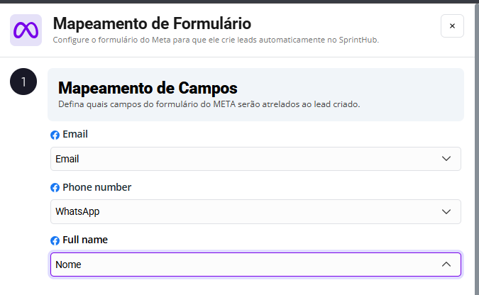 A primeira etapa é mapear os campos do lead, ou seja, o que ele preencher no formulário será cadastrado também na sprinthub.