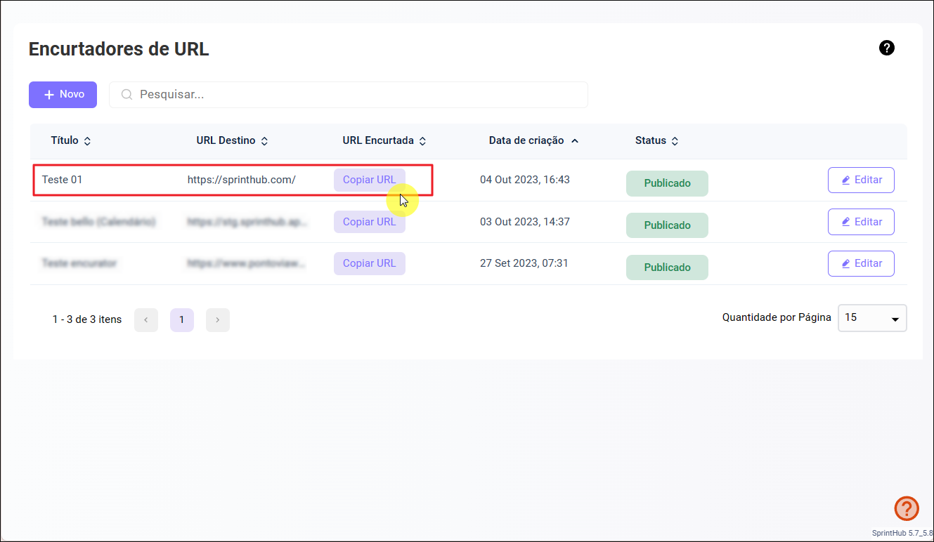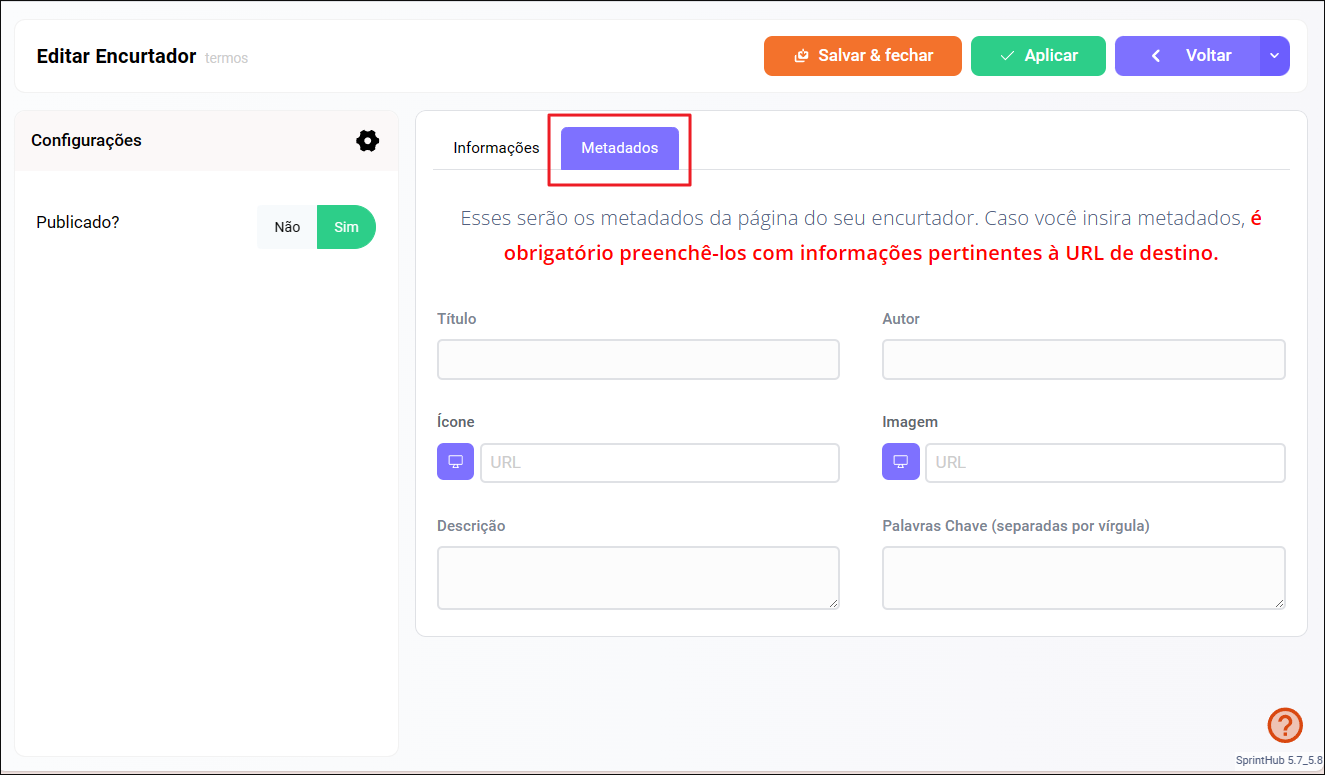 **Publicado**: Para a URL permanecer **ativa** clique em 'Sim', caso queira **desativá-la** clique em 'Não'.