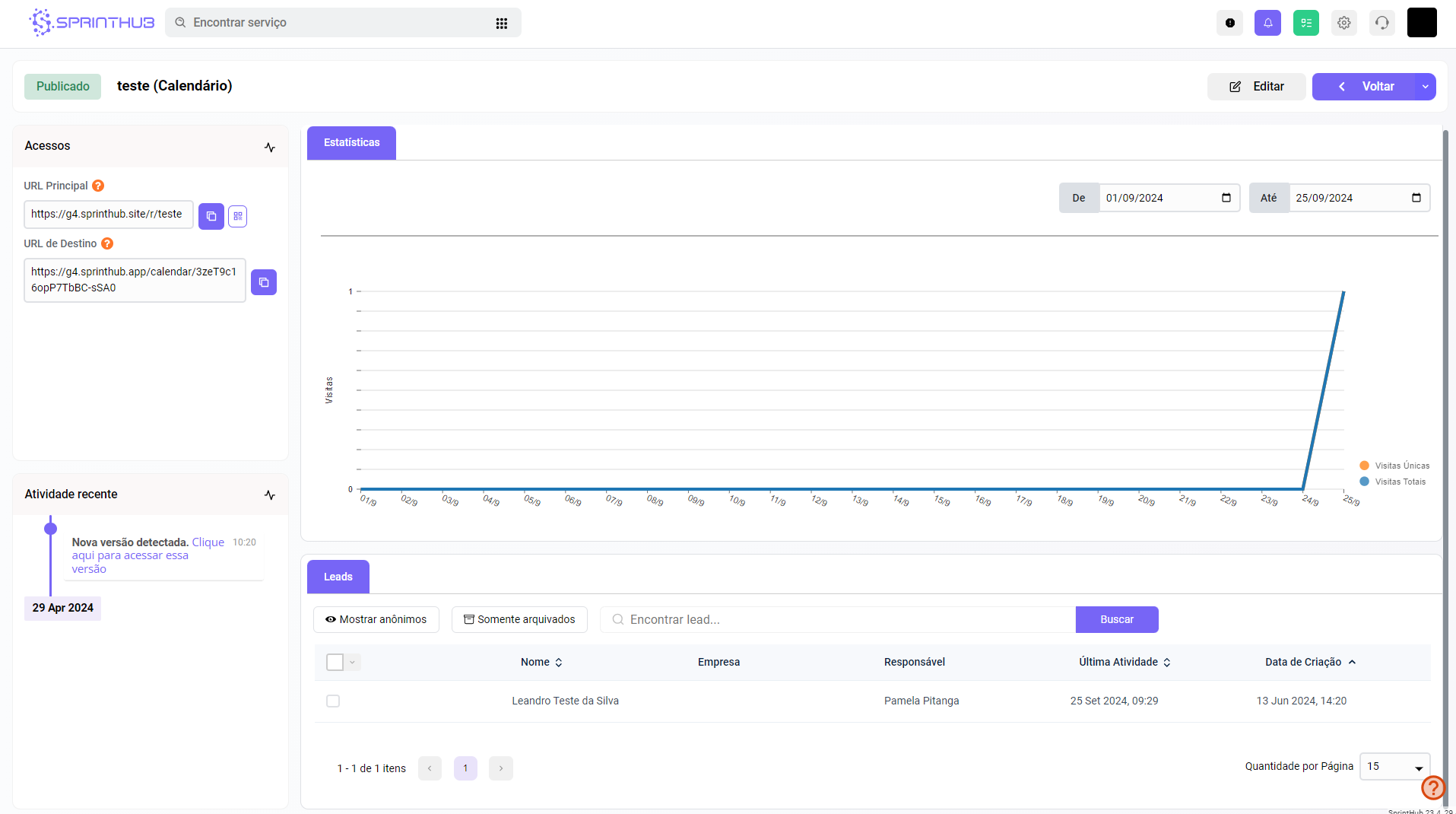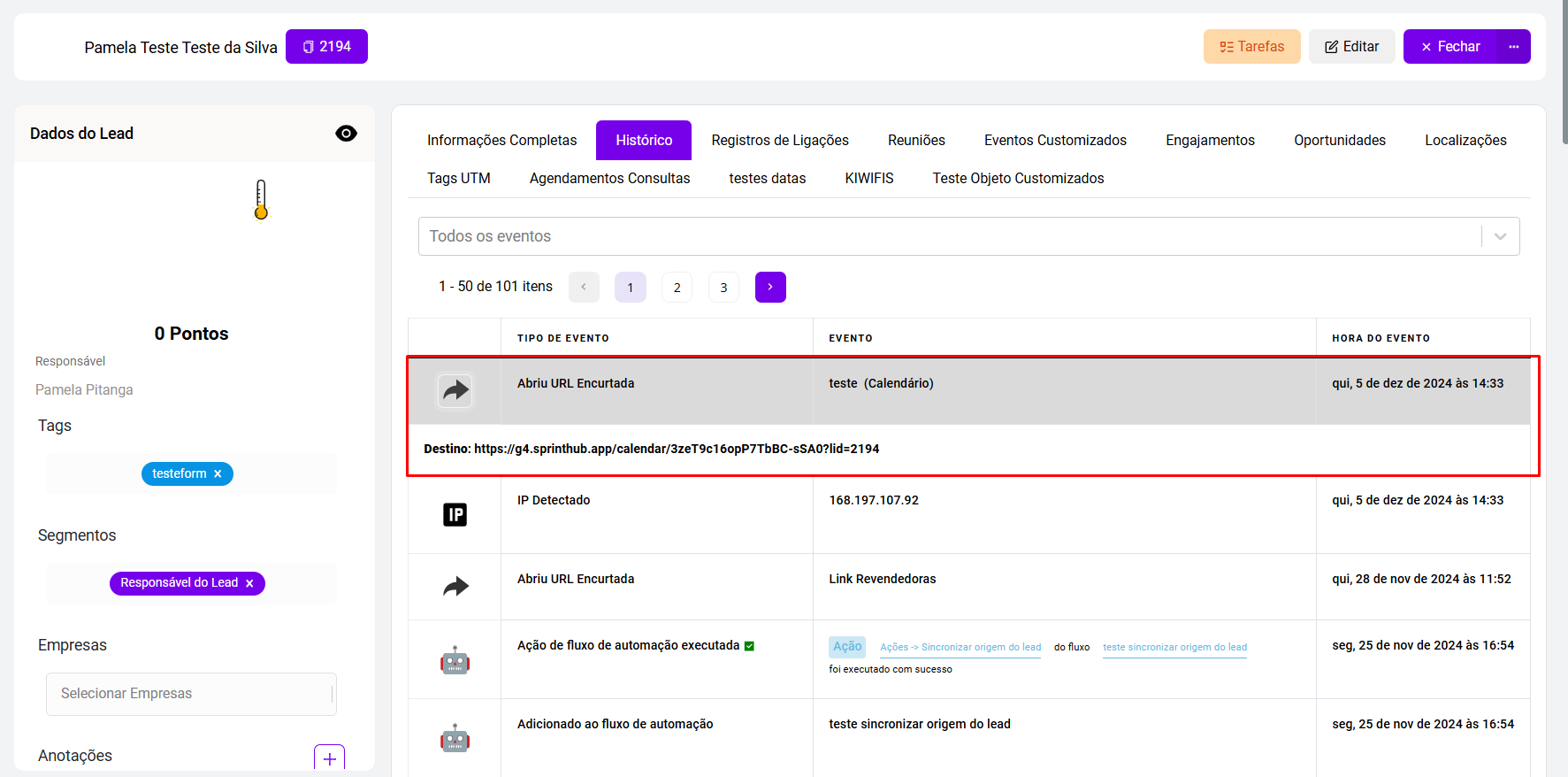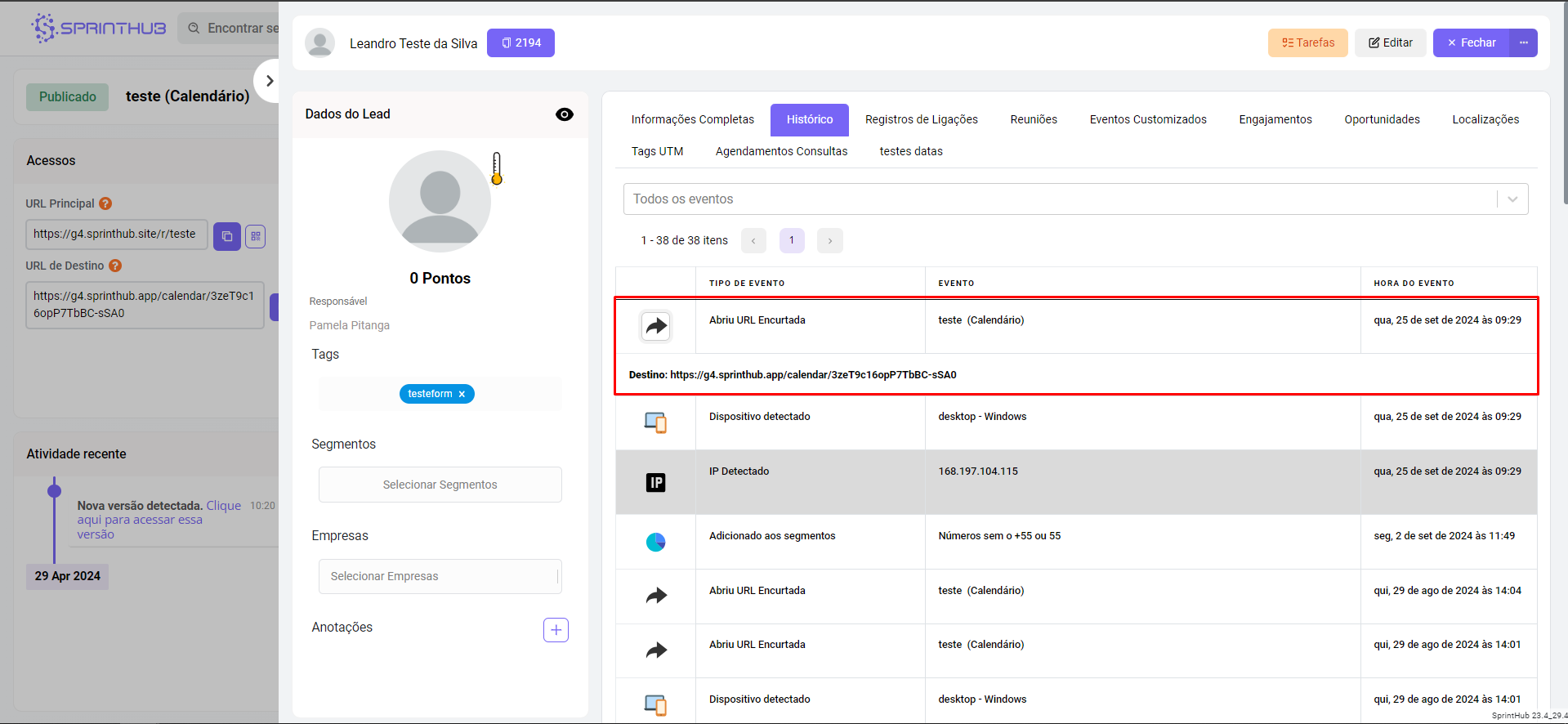 * A área de estatísticas exibirá informações sobre cliques, Leads e atividades recentes. Além disso, é possível consultar o histórico do Lead para verificar se ele clicou na URL e qual foi o link acessado.
