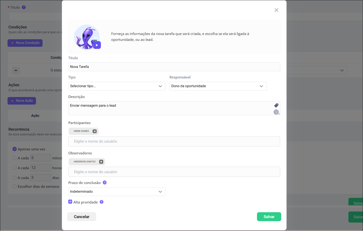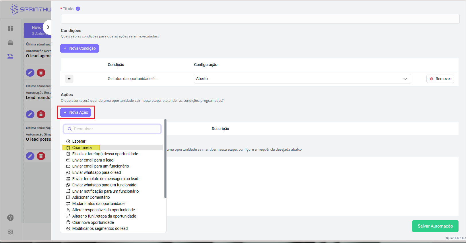 '**Criar Tarefa**': Você pode programar uma tarefa para a equipe fazer um acompanhamento personalizado após um determinado status.