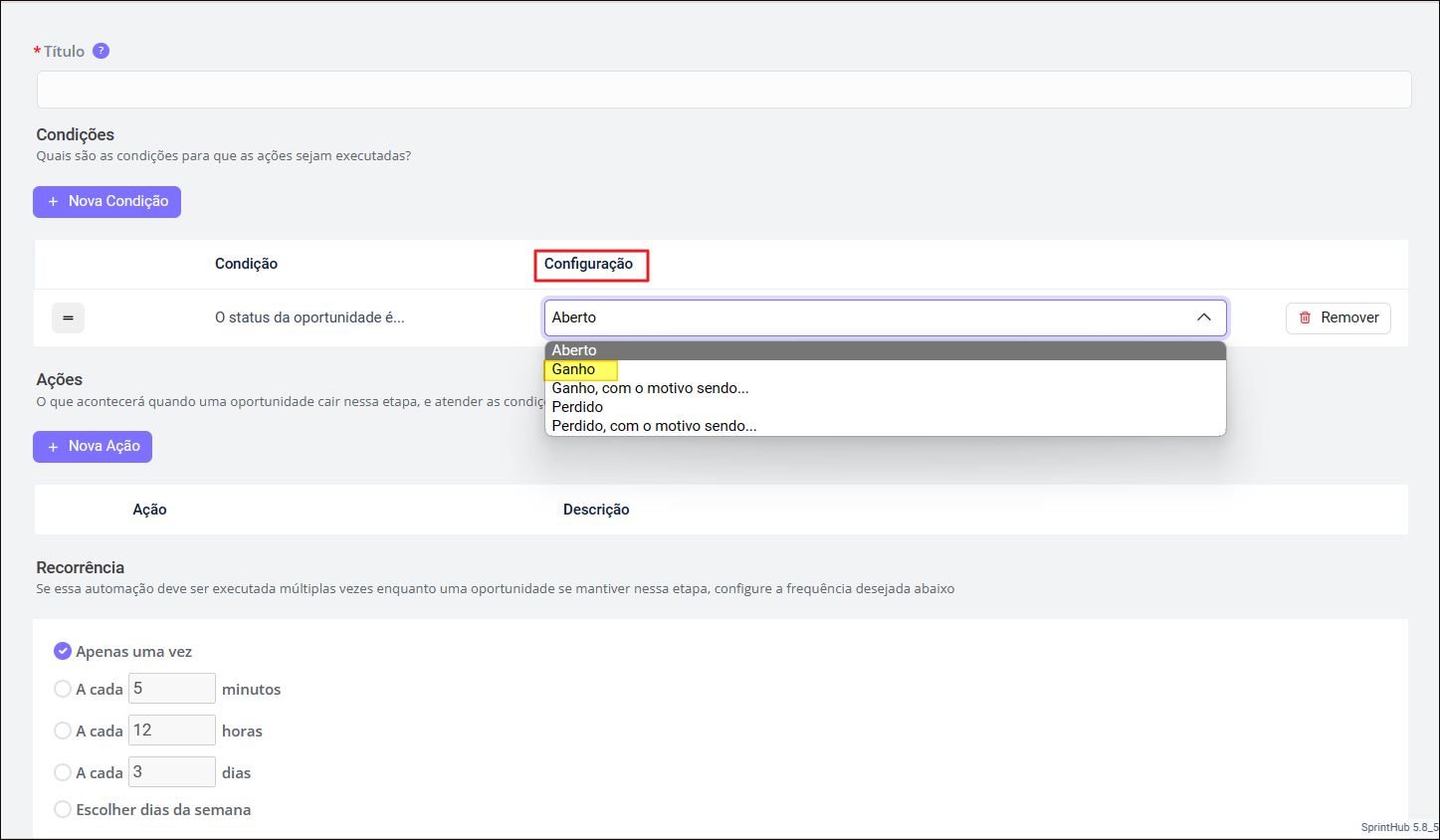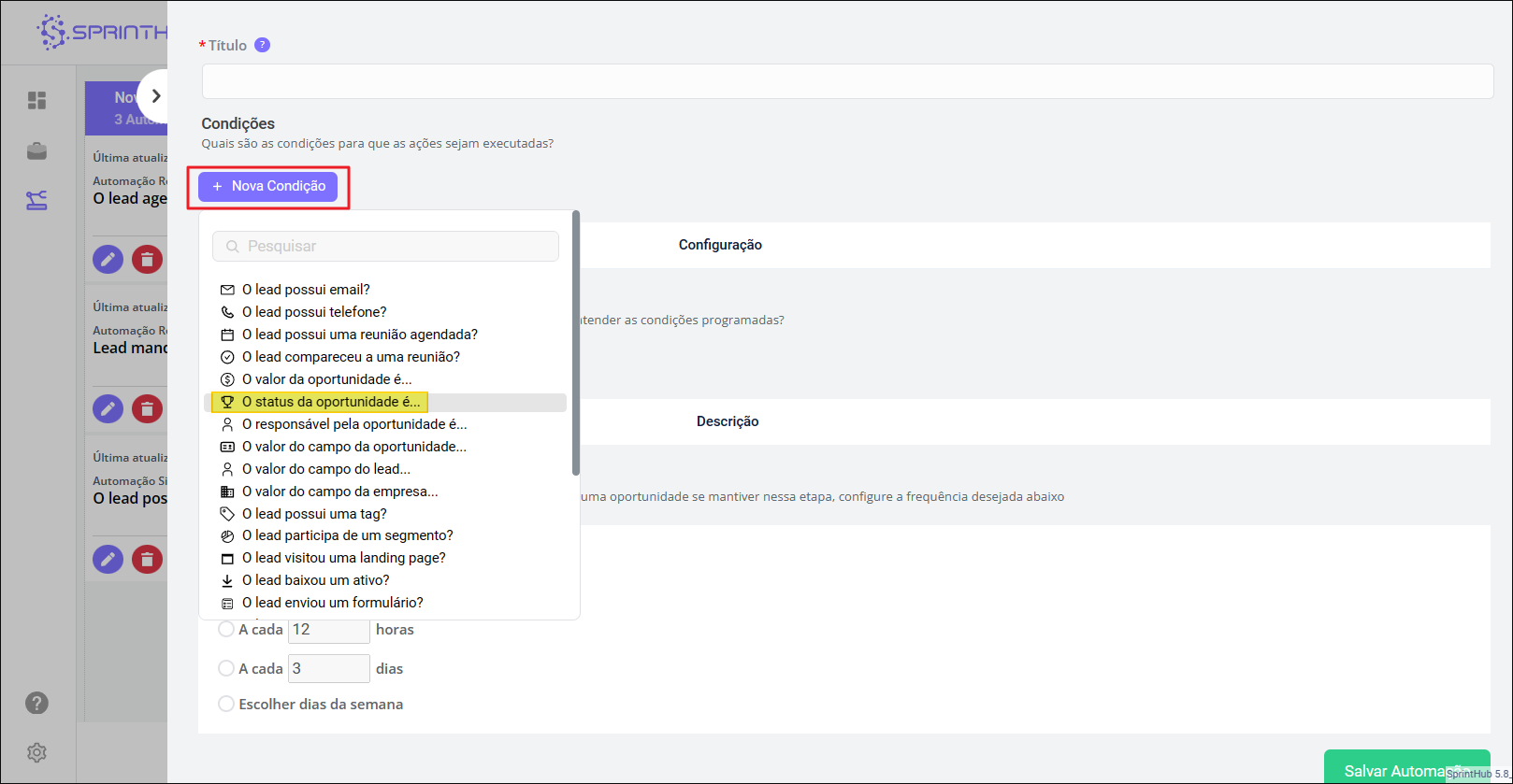 Defina o **título** e a **condição**, que, neste caso, será '*O status da oportunidade é?*'.