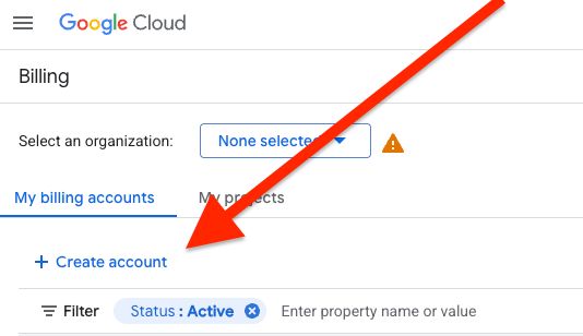 * No menu principal do Google Cloud Console, clique em **Billing e Create account**.