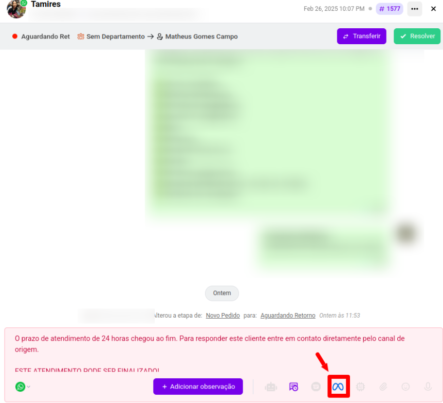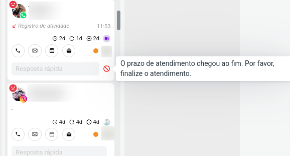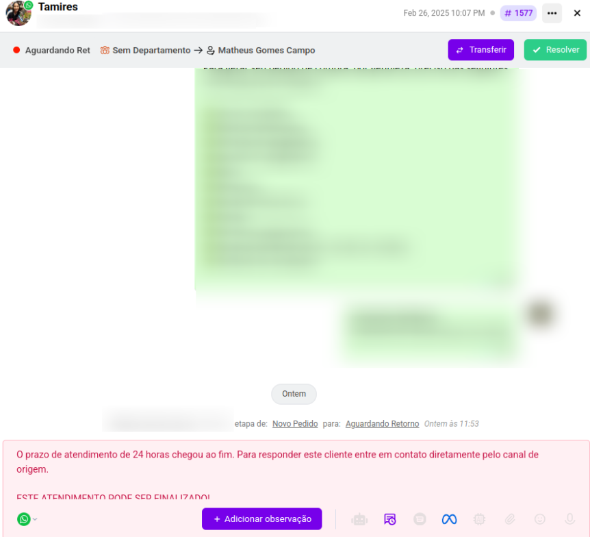 * Se o atendimento já passou das 24h, há uma notificações que instruem o atendente a encerrar conversas inativas cujo prazo de resposta já foi ultrapassado.
