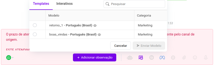 * Caso o tempo esgote, a plataforma exibe um aviso informando que o contato com o cliente só poderá ser retomado via envio de um template de mensagem.