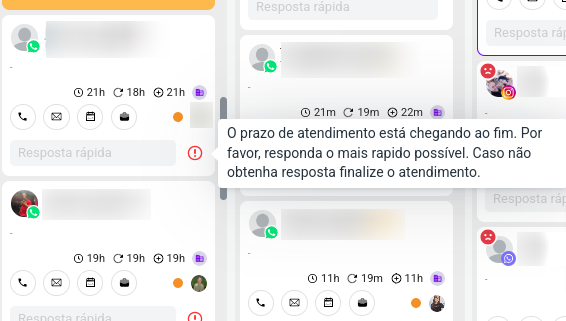 * No card de atendimento mostra alertas de que a janela de 24h está prestes a expirar, indicando que o atendente deve responder rapidamente ou finalizar o atendimento.