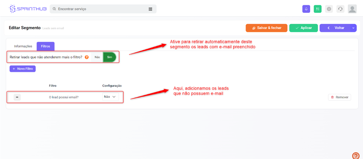 Neste exemplo, colocamos em um segmento leads que não têm e-mail preenchido.