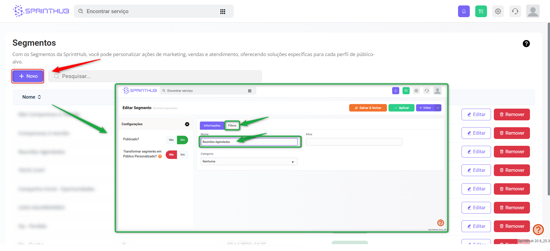 A seguir vamos **criar os segmentos:** Reuniões Agendadas, Compareceu à reunião, Não Compareceu à reunião.