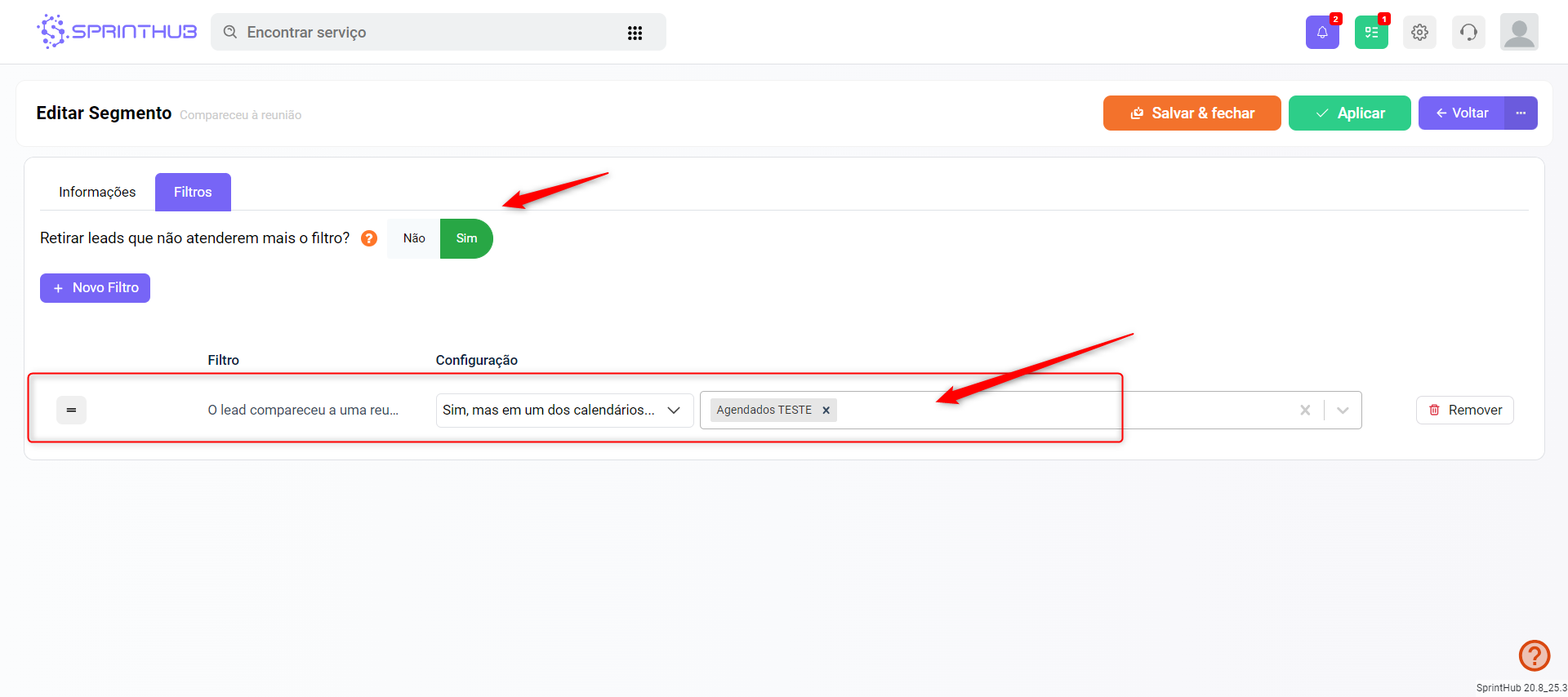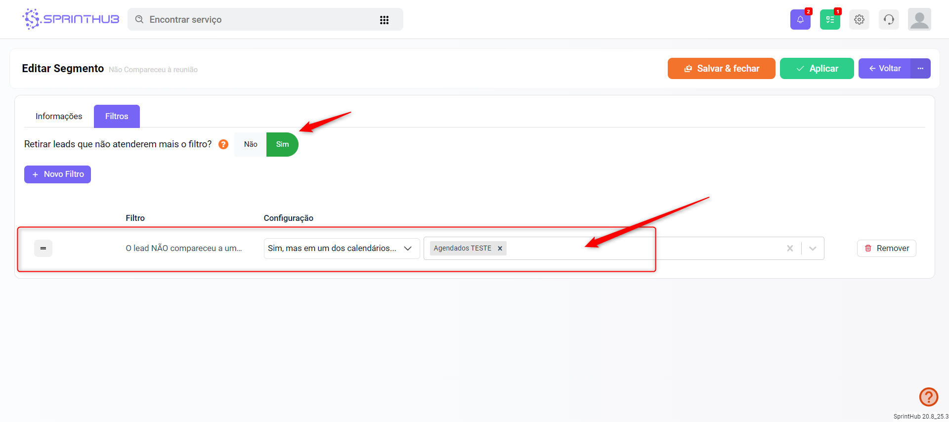 * Clique em +Novo Filtro e adicione o filtro “O lead NÃO compareceu a uma reunião” >> Sim e indique o calendário.