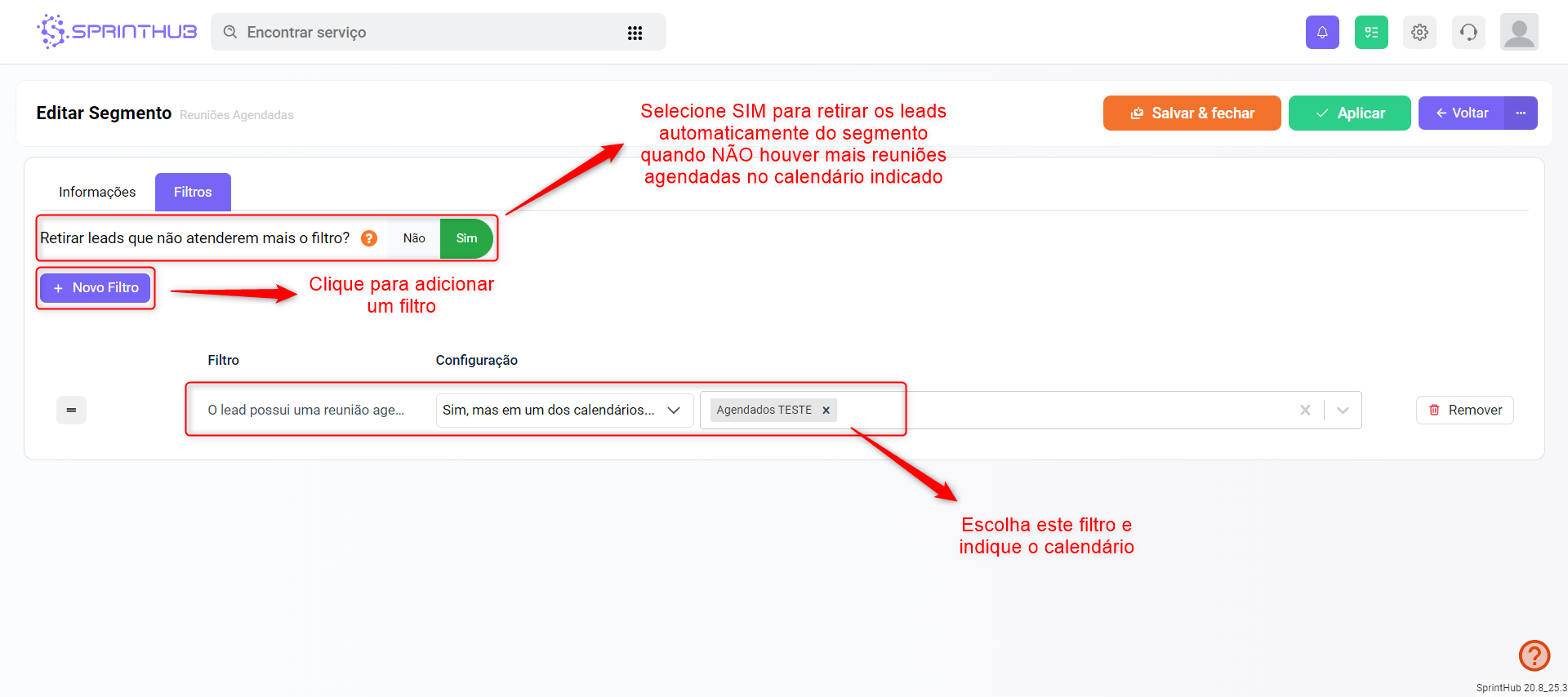 Esta funcionalidade garante que os leads que não tiverem mais uma reunião agendada neste calendário, sejam retirados deste segmento automaticamente.\