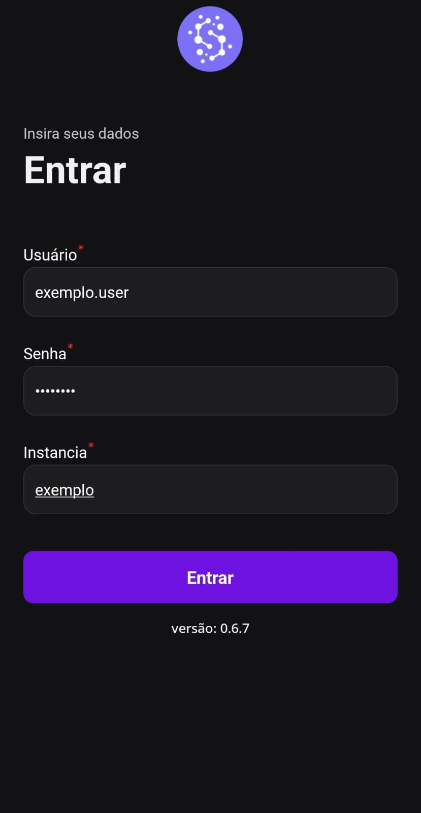 Os campos **Usuário** e **Senha** no aplicativo são os mesmos utilizados para acessar a versão web da SprintHub. Certifique-se de usar as credenciais corretas para evitar problemas de autenticação.